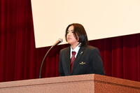 前生徒会会長沖琉雅くんが、これまでの活動を振り返り「きょうで、第21代生徒会は任期を終えることになります。2年間の活動期間でしたが、初めは何もわからないところから、先輩方に多くのことを教えてもらい、今では自分が次の世代に伝える立場になりました。この1年間生徒会長として生徒会を運営していくにあたって必要不可欠だったのは役員の仲間たちの存在です。どの仕事でも私1人では力が及ばず、仲間の手を借り、時には先生方の力を借りることで、多くの仕事を成し遂げることができました。中でも1番記憶に残っているのが、生徒会行事の球技大会です。学校初の行事であったため、ゼロから計画、運営を行わなければならず、忙しい毎日でした。ですが、仲間や多くの先生方と連携をとり、一つの行事として学校を盛り上げることができたと思います。長いようであっという間の2年間が終わり、次は新しい生徒会が学校を盛り上げてくれるはずです。さらに良い生徒会活動を期待しています。最後に、私たち生徒会を支えてくれた全校生徒の皆さん、先生方、本当にありがとうございました」と、誠実な人柄が伝わる、丁寧な挨拶をしてくれました。