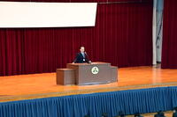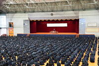 会場に整列する1、2年生へは「準備という点においては、いまここにいるみなさんにも同じことが言えます。それぞれ次の学年に進級し、やがては社会に出て活躍する時が訪れます。勉強や身体を鍛えることはもちろんですが、いつ社会に出ても通用する人材となるために、高校生活の日々の生活のなかで心掛けて欲しいことがあります。それはいろいろな人と交流することです。本校はざまざま地域から2,000名を超える個性豊かな生徒が集まる学校です。生涯の友を得ることもできます。また、様々な考えや自分とは異なる意見を持つ人との交流を広げ、互いを認め合うことを学ぶこともできるのです。