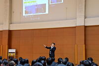 併設校である清和大学の沖埜先生は、「1年前中学生として高校受験の渦中にあったみなさんが、いま高校1年生の終盤を迎えています」と1年の短さを確認した上で、大学・短大、専門学校、就職、それぞれの選択肢のメリット・デメリットについて説明していただきました。進学にかかる費用、生涯獲得賃金、資格取得などの詳しい解説に、生徒たちは深い関心を示しました。