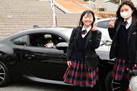 トヨタのYaris GR-FOUR、同GR86、そして往年の名車スバル360が並び、ちょうど下校時の生徒たちがもの珍しそうに集まり、3台の車の周りに人だかりができていました。