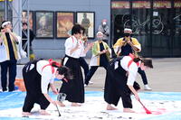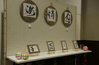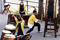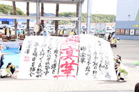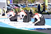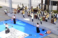 現在イオンモール木更津で、書道部の「校外展」が開催中です。本日は展示と併行して、屋外催事場ライブパークにて、和太鼓部とのコラボパフォーマンスが行われました。