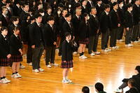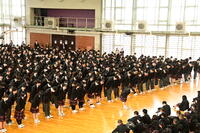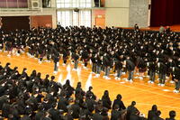 会場の前方に1年生、後方に2・3年生が整列。生徒会指導部宍田先生の指示で、新入生と上級生が体育館の中央で向かい合う態勢で整列しました。