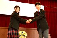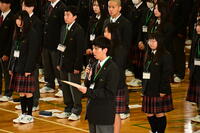 先ずは上級生から1年生に対して、歓迎の気持ちを示しました。生徒会長の池田さんが列の先頭に立ち、「1年生のみなさん、ご入学おめでとうございます。このように多くの新入生のみなさんをお迎えし、これから同じ学校で高校生活を送る仲間となれたことを、とても嬉しく思います。高校生活はいままでと異なり戸惑うことも多いと思いますが、ここにいる上級生や生徒会のメンバーに気軽に相談して下さい。また、部活動にも積極的に参加し、高校生活を充実した、有意義なものにして下さい。応援しています」と、1年生を温かく迎え入れる気持ちとともに、激励のことばを伝えました。