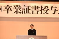 根路銘さんの丁寧な進行で、謝恩式が始まりました。伯部くんから「開式のことば」が述べられ、卒業生代表、本島くんが登壇しました。「記憶に残るのは、学校行事の様なイベントばかりでなく、教室の日常での出来事や友との何気ない時間でした。当たり前の様に過ごした授業の時間も友だちと笑い合った休み時間も、いま思えば確かな安心をもたらしてくれる貴重なひと時」であったと、3年間を振り返りました。不安や行き場のない怒りを抱いたり人間関係に悩んだりした時に真剣に話を聴いてもらえたこと、髪型や制服の着こなしを故意に崩すような幼い自己主張に対しても全否定をすることなく優しく諭してもらったことなどを例に挙げ、「今後どの様な進路に進もうと、ここまで丁寧に寄り添い成長を見守ってもらえる大人と出会う機会はない」であろうと3年間指導を受けた教職員に対して感謝のことばを伝えました。