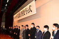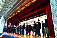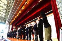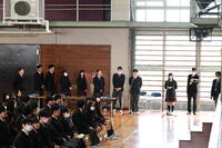 「前日表彰」の部を終え、体育館に残った3年生たちは、卒業に際して教職員への感謝の気持ちを伝える『謝恩式』を催しました。クラスの代表が、学校長をはじめ壇上に上がった各学級担任へ感謝のことばを伝え、花束が手渡されました。