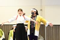 軽快なBGMが流れるなか、書道部が2作品を次々と完成しました。MCを務める兼清さんがそれぞれの作品を紹介。1作品目の『縁(エン)』には、「偶然の出会いが人生を豊かにし、未来を変えていきます。出会いへの感謝の気持ちを表しています」と解説してくれました。