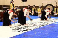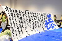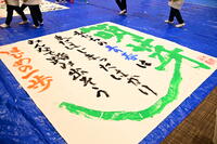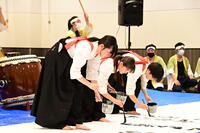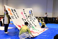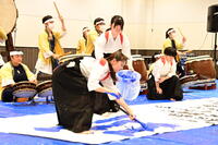 勇壮な和太鼓の演奏に負けじと、書道部の筆裁きにも気合いが込められ、8㍍もある迫力の作品が完成しました。