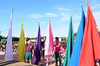 最後に、全7チーム各色の団長が団旗を掲げて朝礼台に集合。体育祭実行委員長、猪股龍司くんが「我々選手一同は、日頃の練習の成果を十分に発揮し、正々堂々競技することを誓います」と力強く宣誓を行いました。