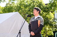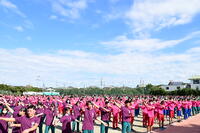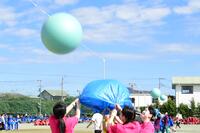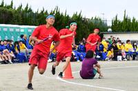スピード長縄に続いて行われたのは、新種目「真心キャッチリレー」でした。4人一組でブルーシートの四隅を握り、その上にバランスボールを乗せて、中央に設置された高さ3メートルのバーを超えるようにボールを跳ね上げ、再びシートでボールをキャッチ。ボールがバトンの代わりとなり、対面にいる仲間とリレーを続けてスピードを競う競技です。一発でバーをクリアーするチームが大半でしたが、なかにはなかなかバーを超えられないチームや風の影響もあり、キャッチに失敗してボールを遠くへ転がしてしまうチームもいて、ハラハラドキドキの場面が続く競技でした。