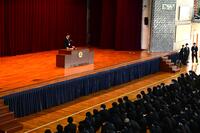 続いて、学校長が文化祭、体育祭を振り返り、生徒たちへ講話を伝えました。「本校の二大行事、『真心祭』文化の部、体育の部が終了しました。その間みなさんがとても楽しそうに活動している姿を見て、たいへん嬉しく思いました。文化祭は2日間で3000名を超える来場者が、体育祭の2日間では1000名を超える保護者が、参観に訪れました。来場していただいたお客様や保護者の方々からは、どちらの行事でも「すごく良かったです」とお褒めの言葉をいただきました。自分たちが楽しんだ上で、「もてなしの気持ち」を忘れないでほしいとお願いしましたが、みなさんはちゃんと、来てくれた人を楽しませる行事を成し遂げてくれました。