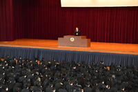 会場に整列する1、2年生へは「準備という点においては、いまここにいるみなさんにも同じことが言えます。それぞれ次の学年に進級し、やがては社会に出て活躍する時が訪れます。勉強や身体を鍛えることはもちろんですが、いつ社会に出ても通用する人材となるために、高校生活の日々の生活のなかで心掛けて欲しいことがあります。それはいろいろな人と交流することです。本校はざまざま地域から2,000名を超える個性豊かな生徒が集まる学校です。生涯の友を得ることもできます。また、様々な考えや自分とは異なる意見を持つ人との交流を広げ、互いを認め合うことを学ぶこともできるのです。