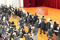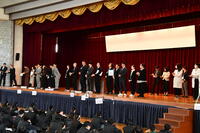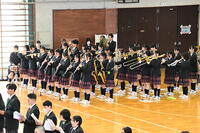 学校長は、本日ご出席がかなわなかった、照井先生(体育)、青栁先生(社会)、平田先生(英語)、平田先生(数学)4名の先生方のお名前を紹介し、「生徒同士の出会いも、先生方との出会いも「縁」です。そして、えにしを交わした先生方がきょう、本校を去られ4月からは新しいステージで活躍します。ご苦労さまの気持ちと、頑張って下さいの気持ちを込めて、拍手をお願いします」と呼び掛けると、生徒たちから温かく大きな拍手が送られました。